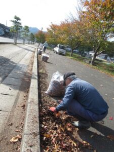 毎年、きれいな花で地区民を楽しませてくれる平田船川沿いの桜並木ですが、秋になるとたくさんの葉が落ち、その落ち葉が路上にたまってしまうことが課題でした。そこで落ち葉の回収をしたところ、70袋以上の落ち葉を集めることができました。天気もよく、旅情もきれいになり気持ちのよい活動となりました。