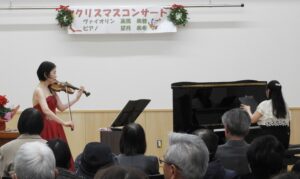 令和7年 12月9日(火) 平田コミセン大会議室にて、ヴァイオリン奏者 高橋美穂氏・ピアノ奏者 望月美希氏をお迎えし、冬のひと時を彩る『クリスマスコンサート』をコミセン大会議室で開催しました。今回のコンサートには、計画していた40名を大きく超える約70名の方にお越しいただきました。プログラムには、ジャズ、クラシック、テレビCMやドラマで耳にしたことのある曲とジャンルを超えた名曲を披露していただきました。また、多くの方がリラックスして音楽を楽しんでくださった様子が見られました。